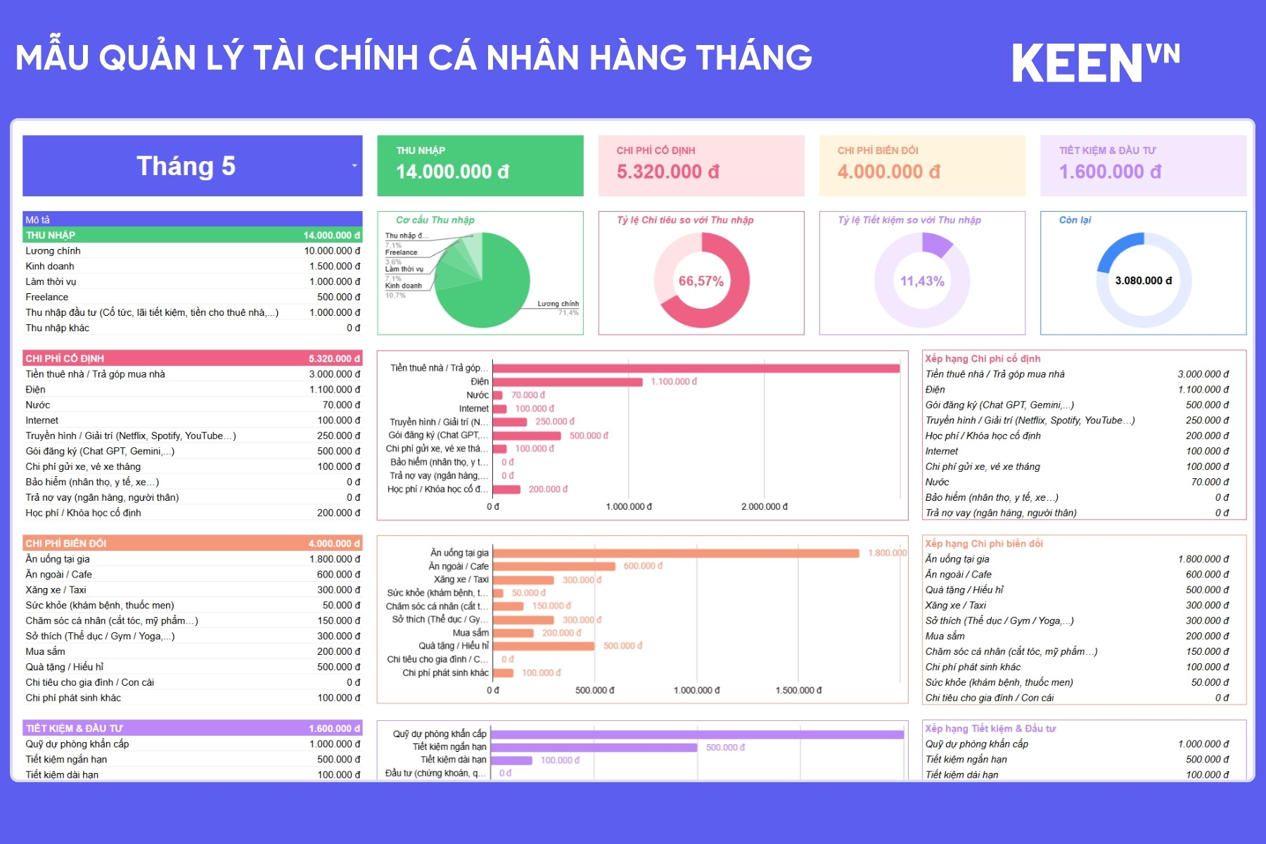 File Mẫu quản lý tài chính cá nhân hàng tháng được thiết kế để giải quyết toàn bộ các vấn đề trên trong một hệ thống duy nhất.