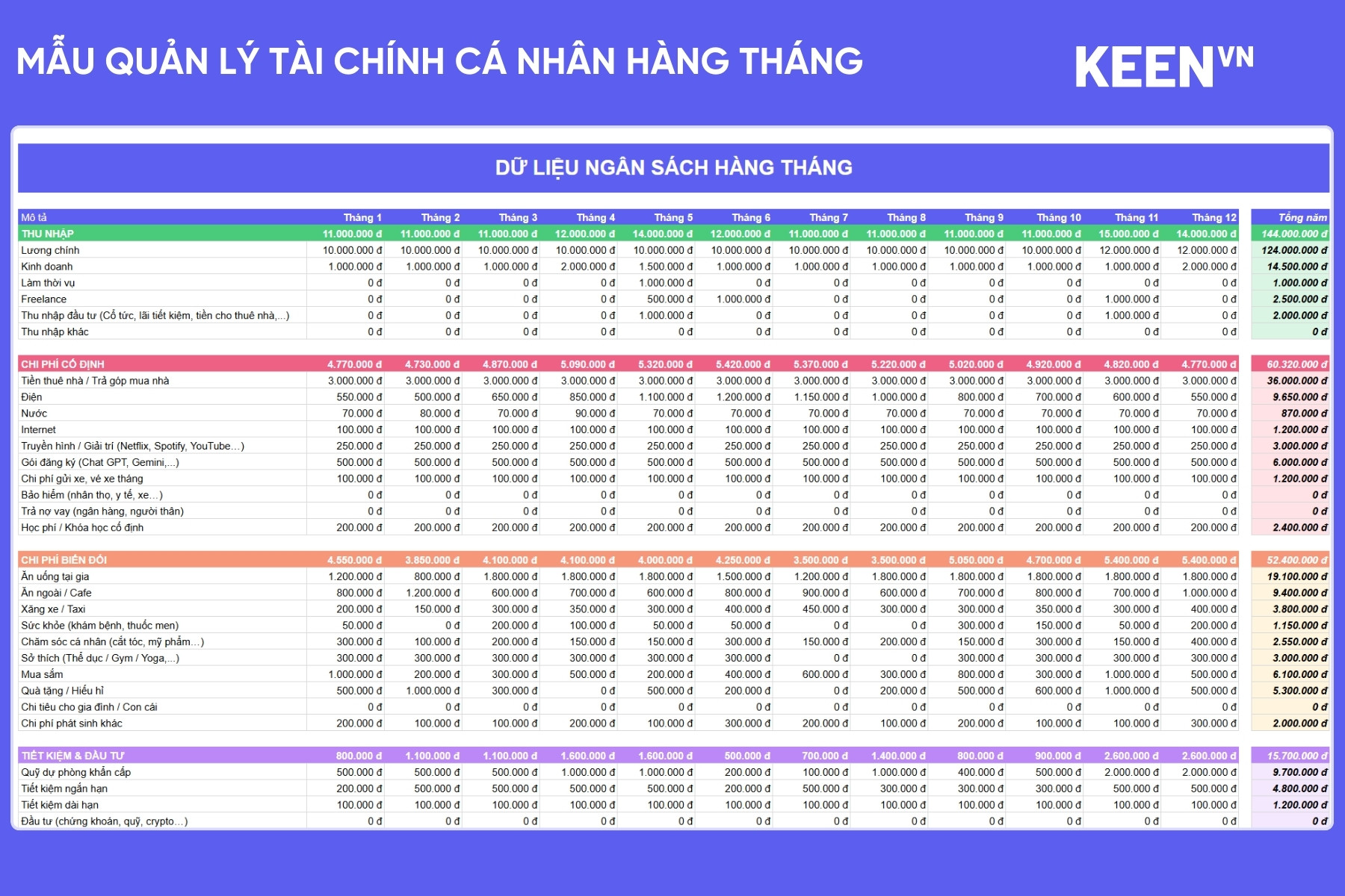 - Bảng dữ liệu ngân sách 12 tháng để nhập thu nhập và chi phí chi tiết
