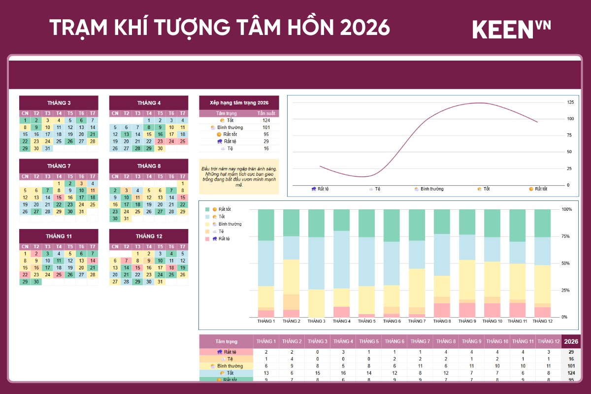 Trạm khí tượng tâm hồn 2026 là file mood tracking được thiết kế như một hệ thống dự báo “thời tiết nội tâm”. Người dùng ghi nhận tâm trạng mỗi ngày, toàn bộ dữ liệu sẽ tự động tổng hợp thành dashboard phân tích năm.