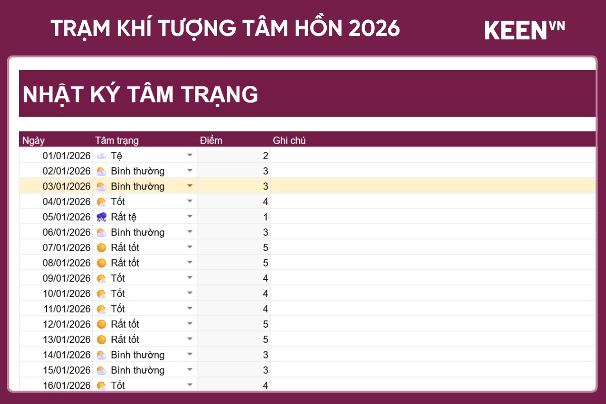 Trạm khí tượng tâm hồn 2026 phù hợp cho người muốn quản lý cảm xúc cá nhân, xây dựng thói quen ghi nhật ký tâm trạng và theo dõi sức khỏe tinh thần xuyên suốt cả năm một cách khoa học và trực quan.